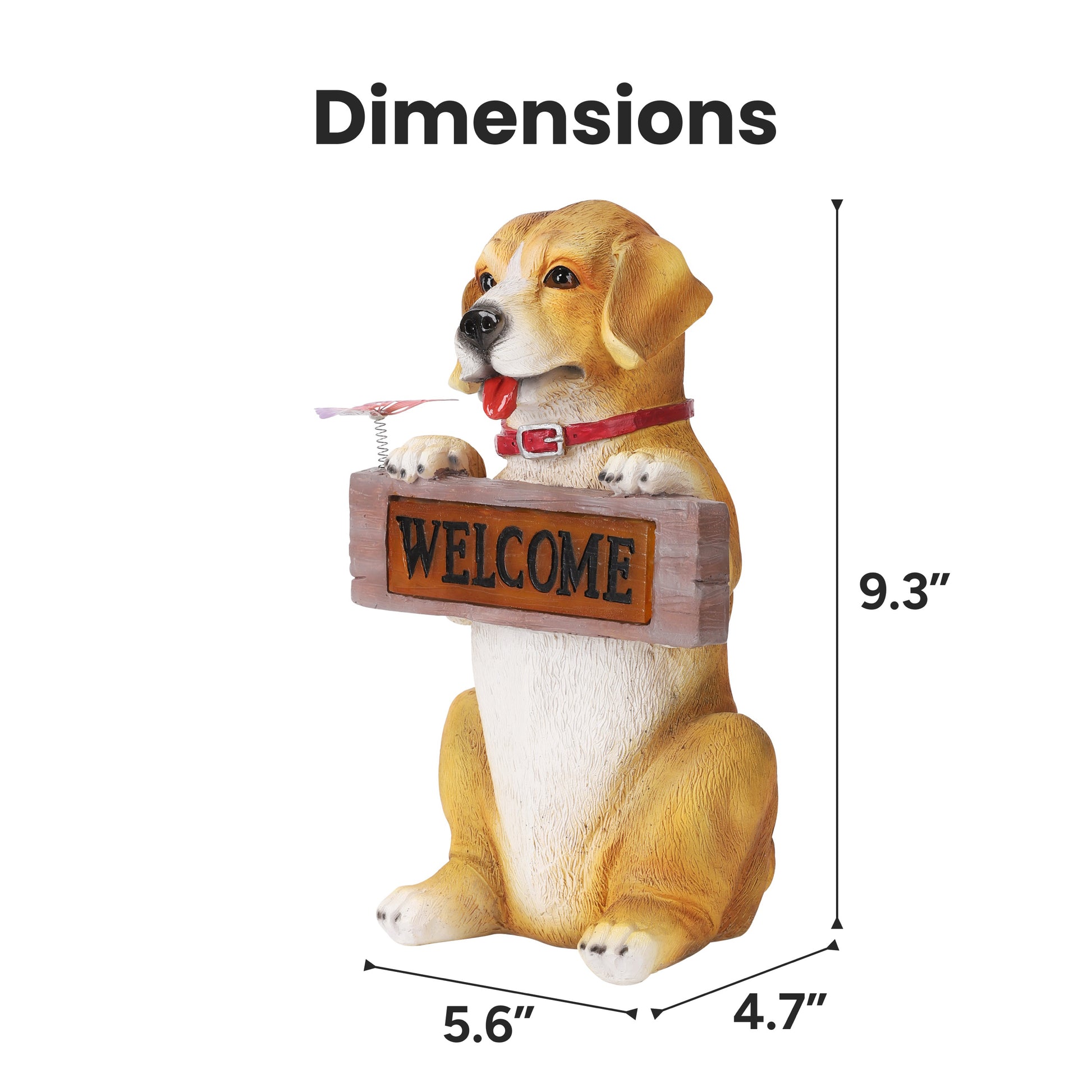 Say hello to Barkley, the cheerful pup who loves greeting guests with a big smile. With his tongue out, bright eyes, and paws wrapped around a bold “WELCOME” sign, Barkley brings instant charm to porches, patios, garden paths, and entryways. A tiny butterfly perched on his ear adds an extra touch of sweetness that makes him even more lovable.