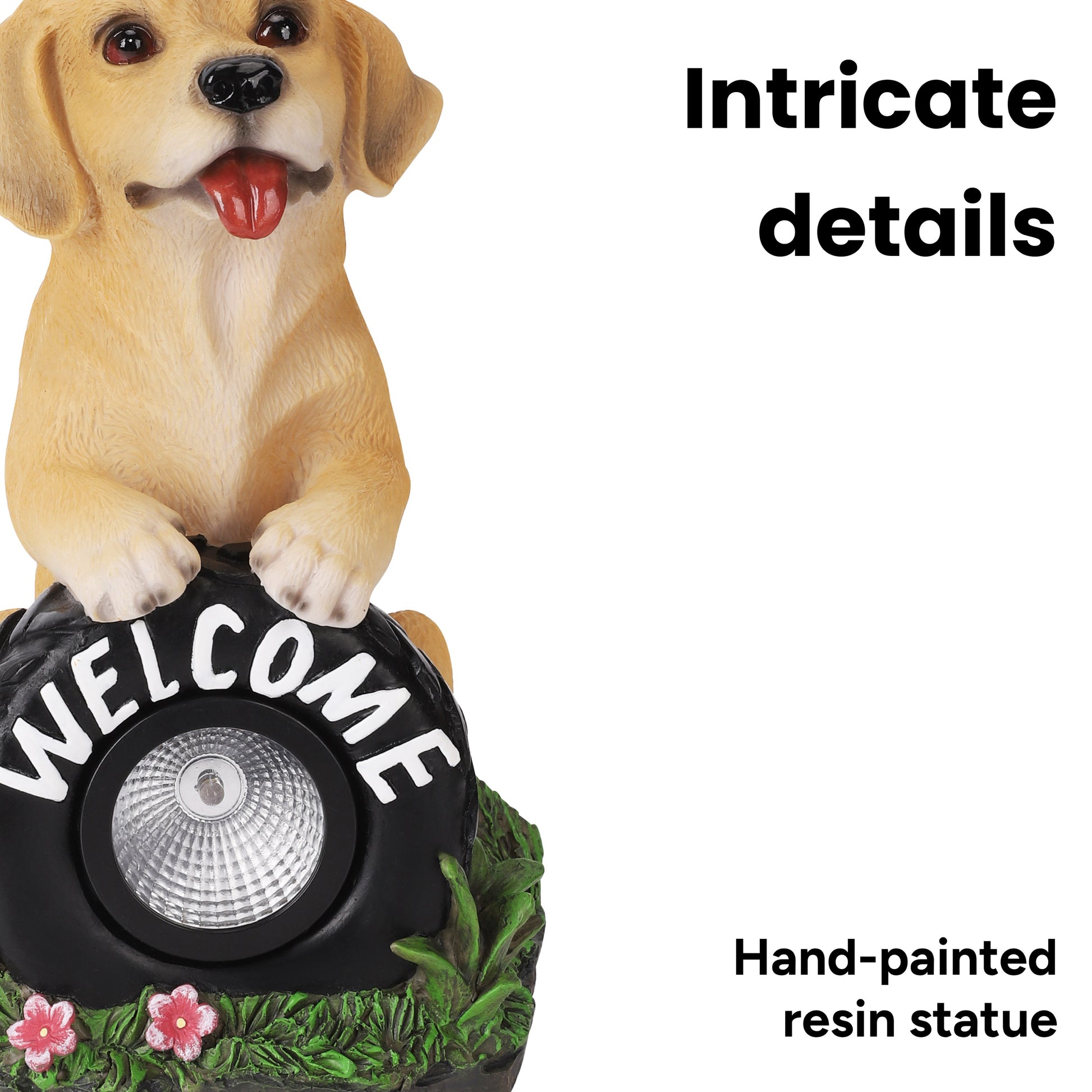 During the day, Buddy lounges in the sunshine while the solar panel quietly charges. When evening arrives, the light in his sign automatically glows, creating a cozy, inviting ambiance that makes your entryway feel extra friendly. The soft LED illumination highlights the playful details — from the grassy base to the little pink flowers — giving your outdoor space a cheerful, heartwarming touch.