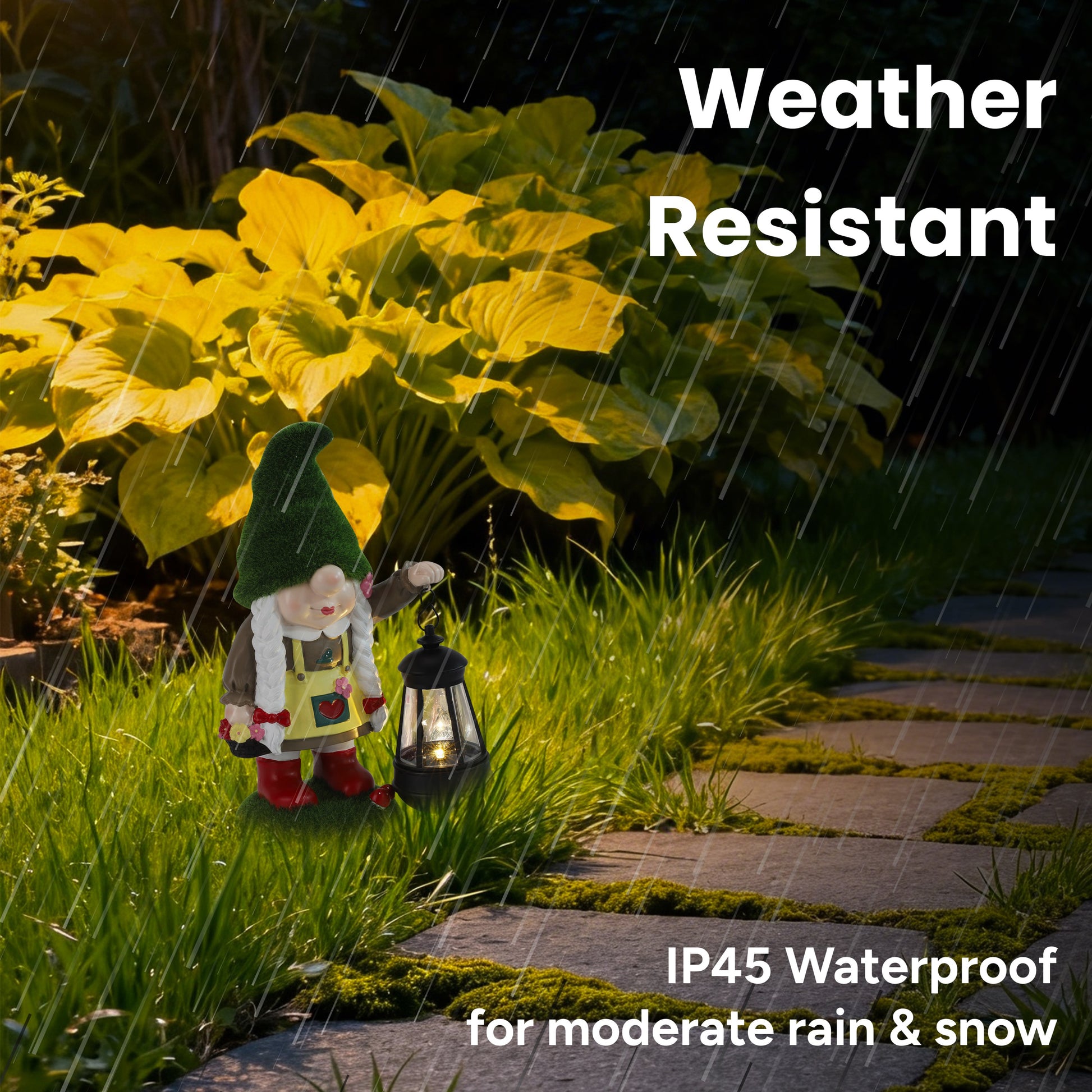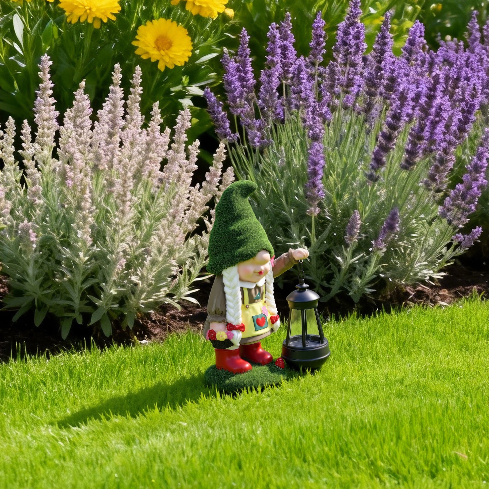 During the day, Greta happily soaks up the sun while her built-in solar panel charges. When the evening arrives, her lantern glows automatically with a warm LED light, creating a soft, welcoming ambiance along pathways, patios, and garden corners. It’s the kind of gentle glow that makes your yard feel whimsical, peaceful, and full of personality.