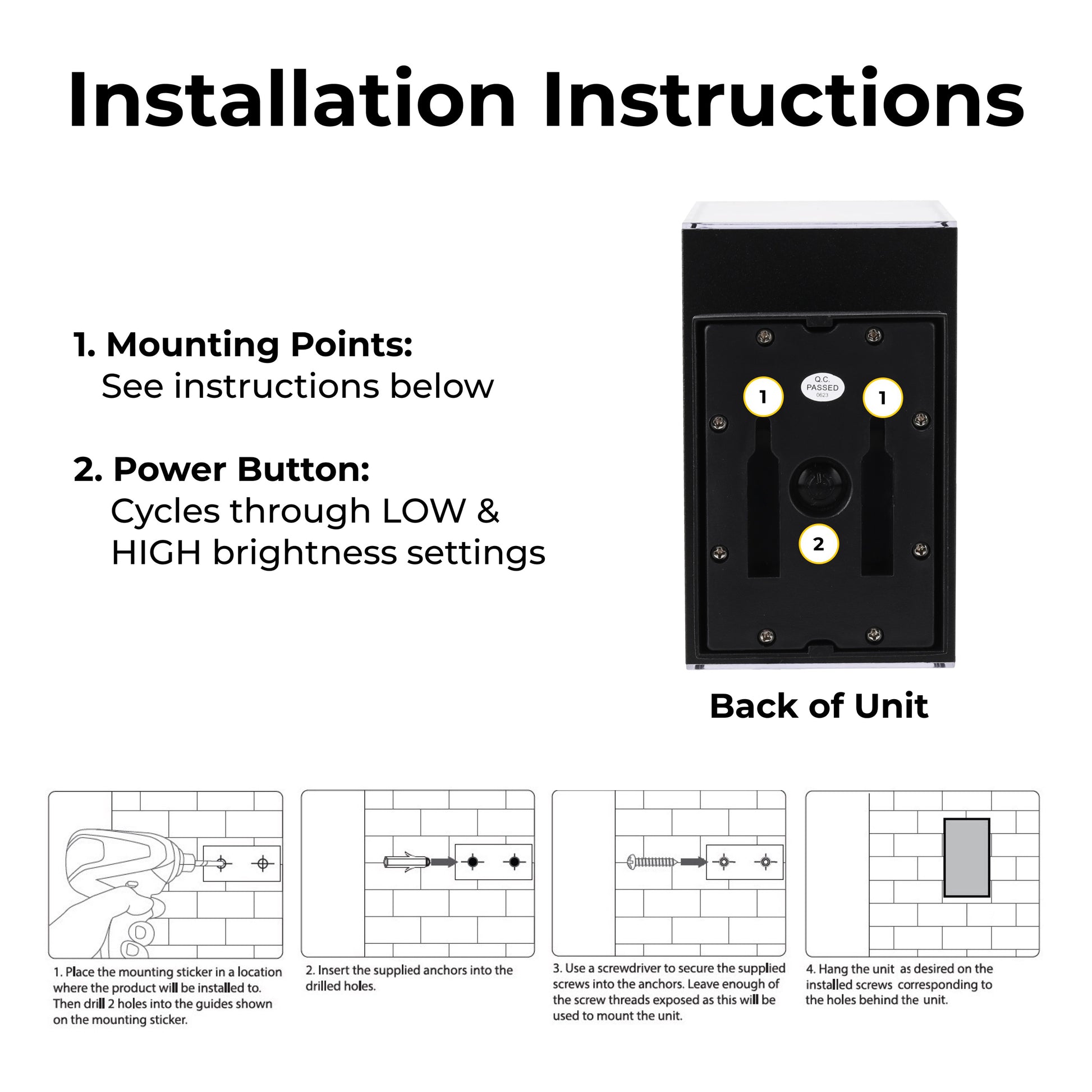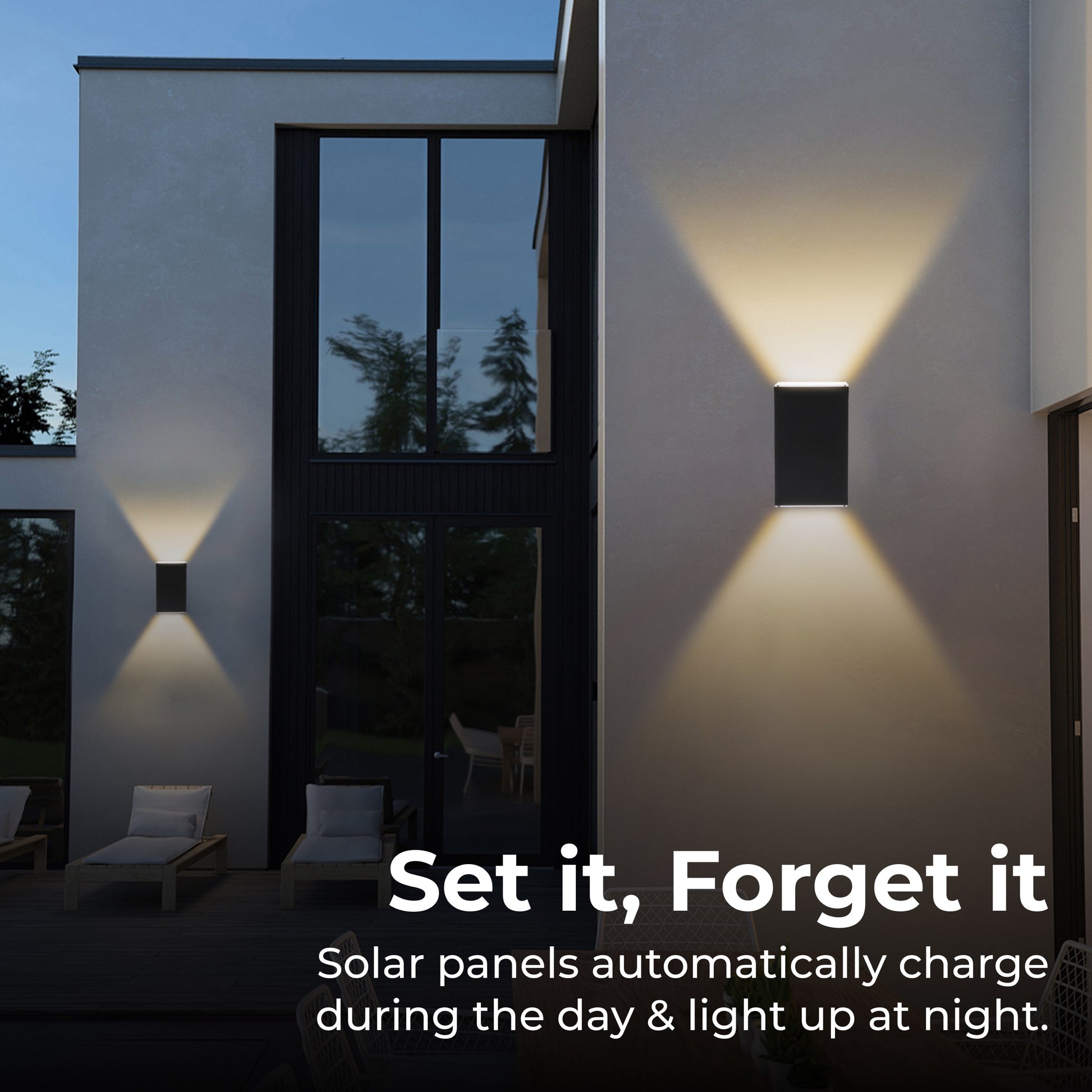 Once installed, the lights are low maintenance. They last 12 hours on a full charge, so you just set it and forget it. Once it’s fully charged it will automatically turn on at dusk and off at dawn. Comes with a dust and water resistance IP65 rating allowing the unit to remain functional outside in most climates. Contains one metal wall light.