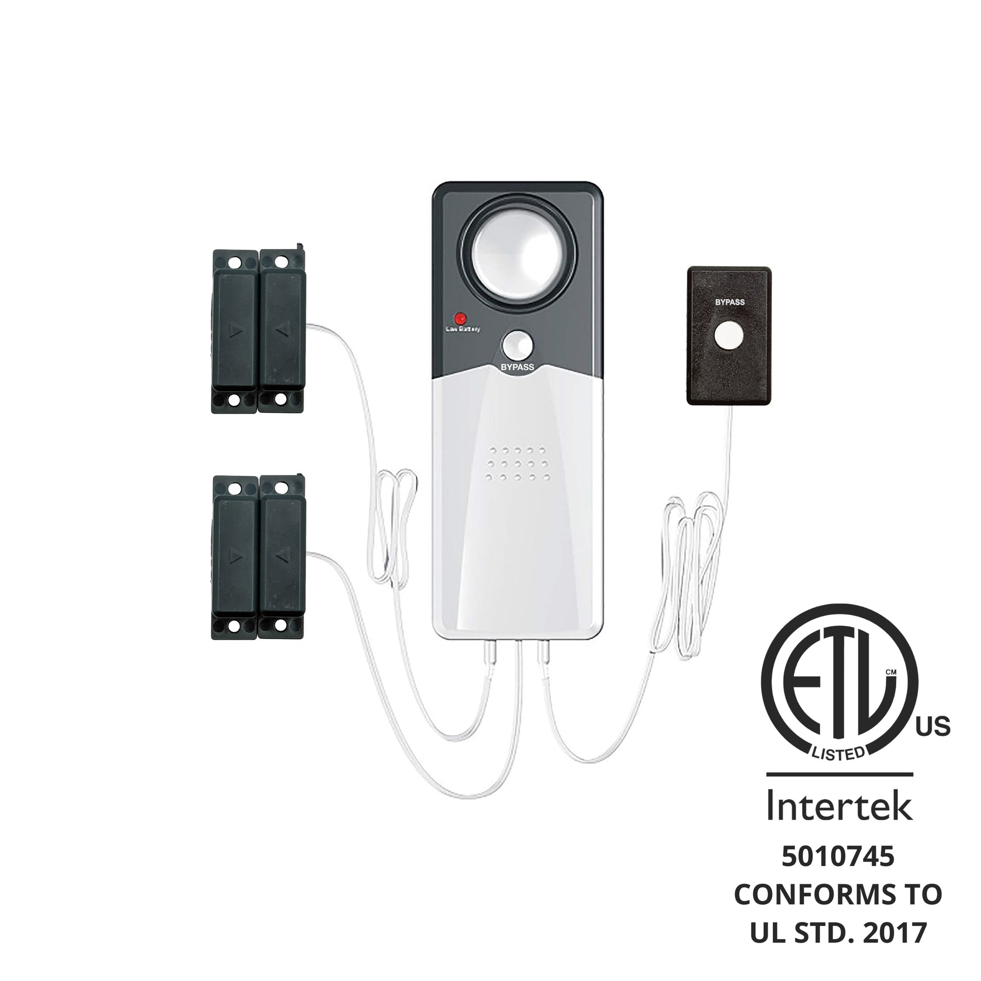 The alarm features a high-output 110 decibel alarm siren that sounds whenever the magnetic contact is broken. Adults can easily enter/exit from both sides by using the two included bypass buttons, temporarily disabling the alarm for 10 seconds.