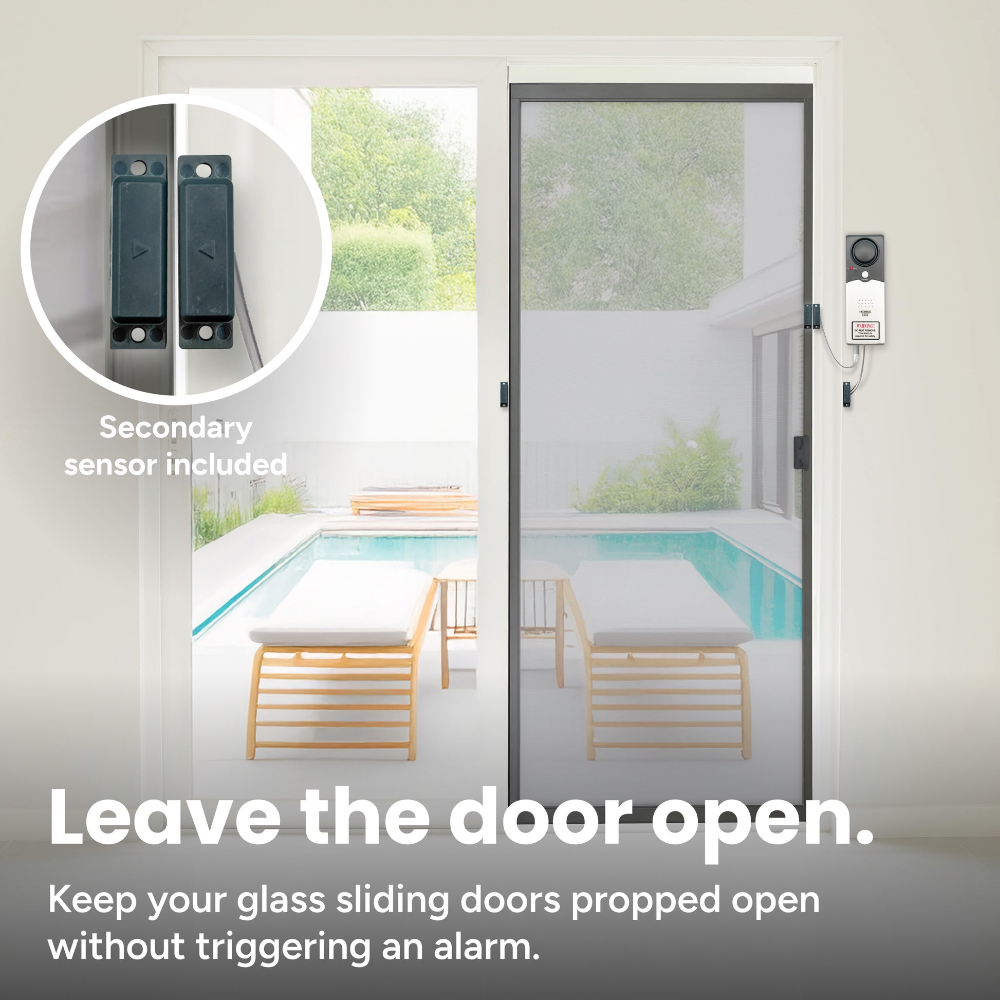 This alarm also features a patented secondary sensor, designed to be used with sliding doors that have a complementary screen door. When secondary sensor is installed, the alarm will only trigger when both the screen & glass doors are opened, allowing you to keep your glass door propped open to let in the breeze.