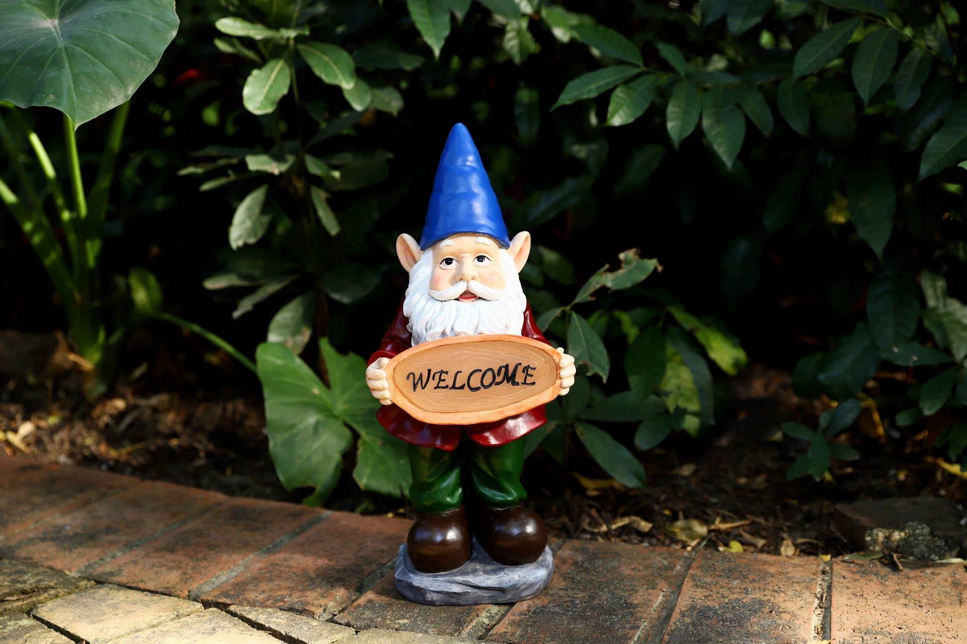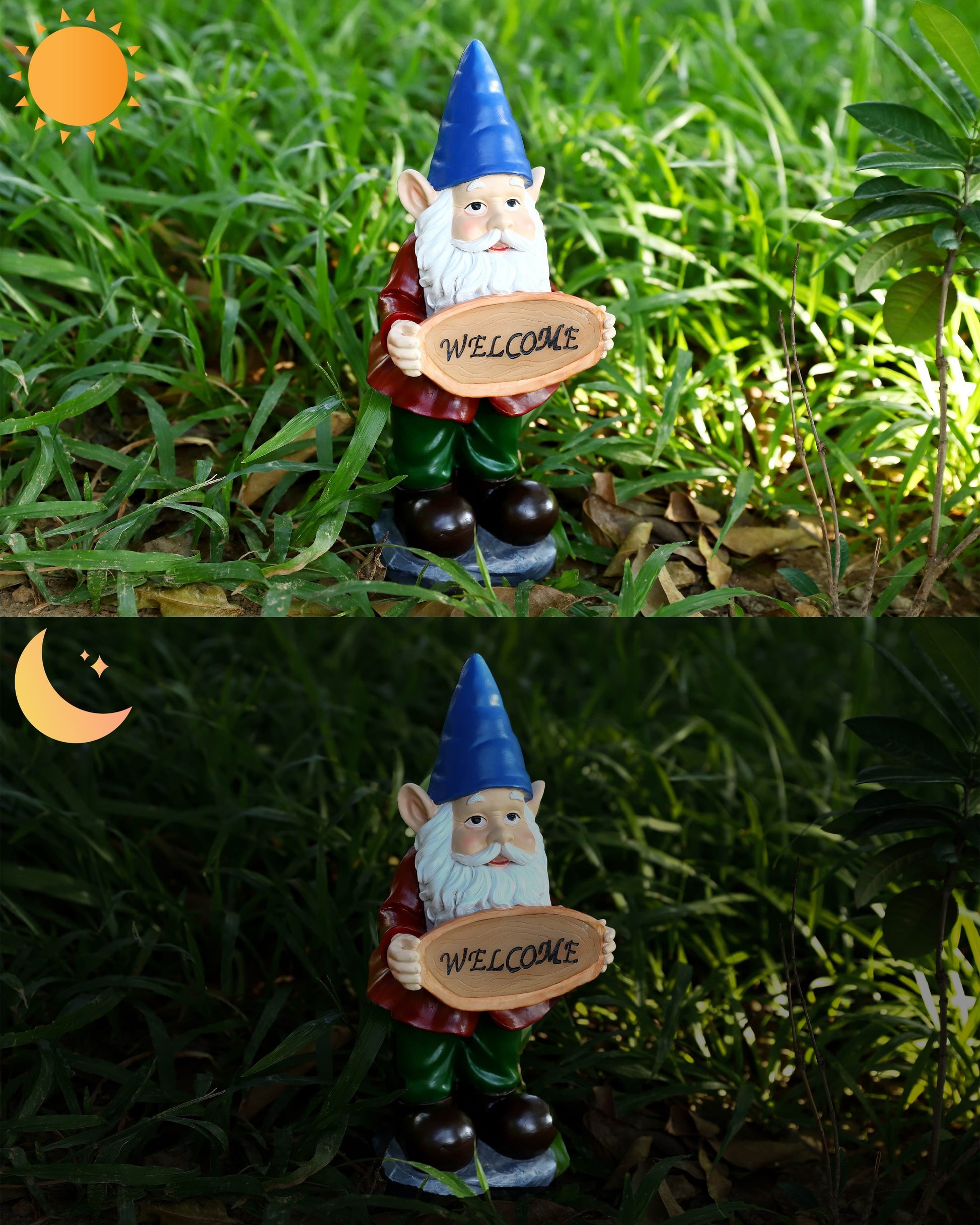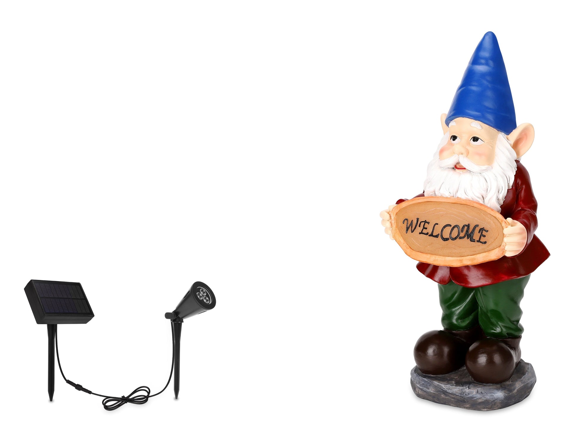 The most perfect little welcome sign welcoming everyone coming in or passing by. The solar light works perfectly. I put the solar panel out and it lights up my gnome all night with the spot light. Lixture attached here. The colors on this little guys is darling.