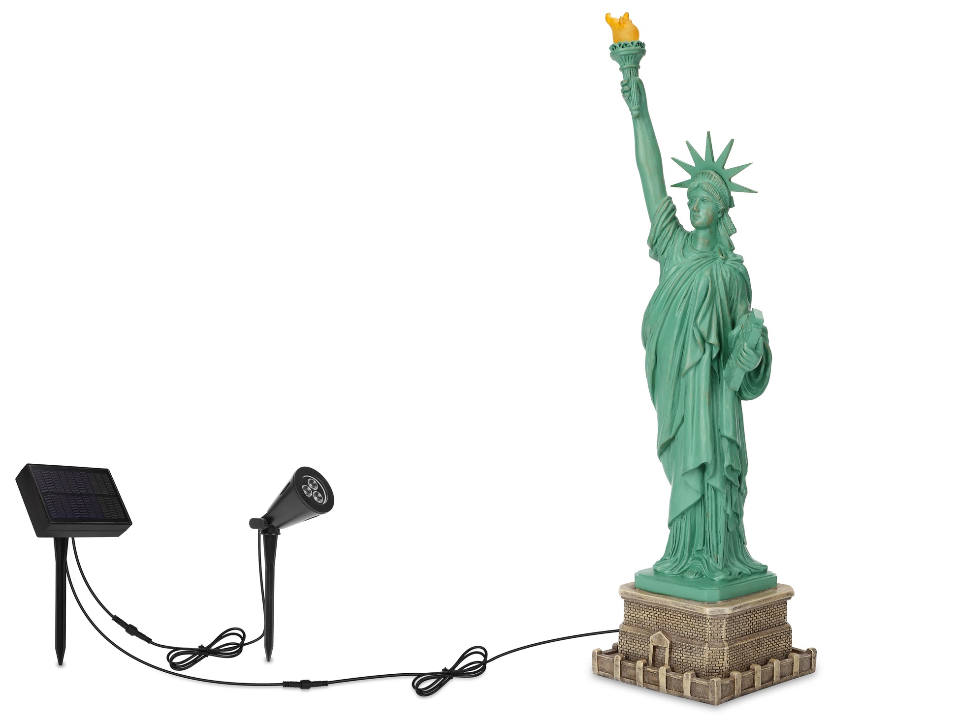 Enhance your garden, yard, or patio with the iconic symbol of Liberty! The solar-powered torch flame automatically lights up to give your backyard a unique look at night. This unit also ships with an external solar spotlight that can be positioned to make the entire statue glow at night. Each unit is built with weatherproof resin, beautifully hand-painted, and is guaranteed to last all night on a full charge. This Solar Decorative light will make a great addition to your yard or a great gift to family and friends for their homes.