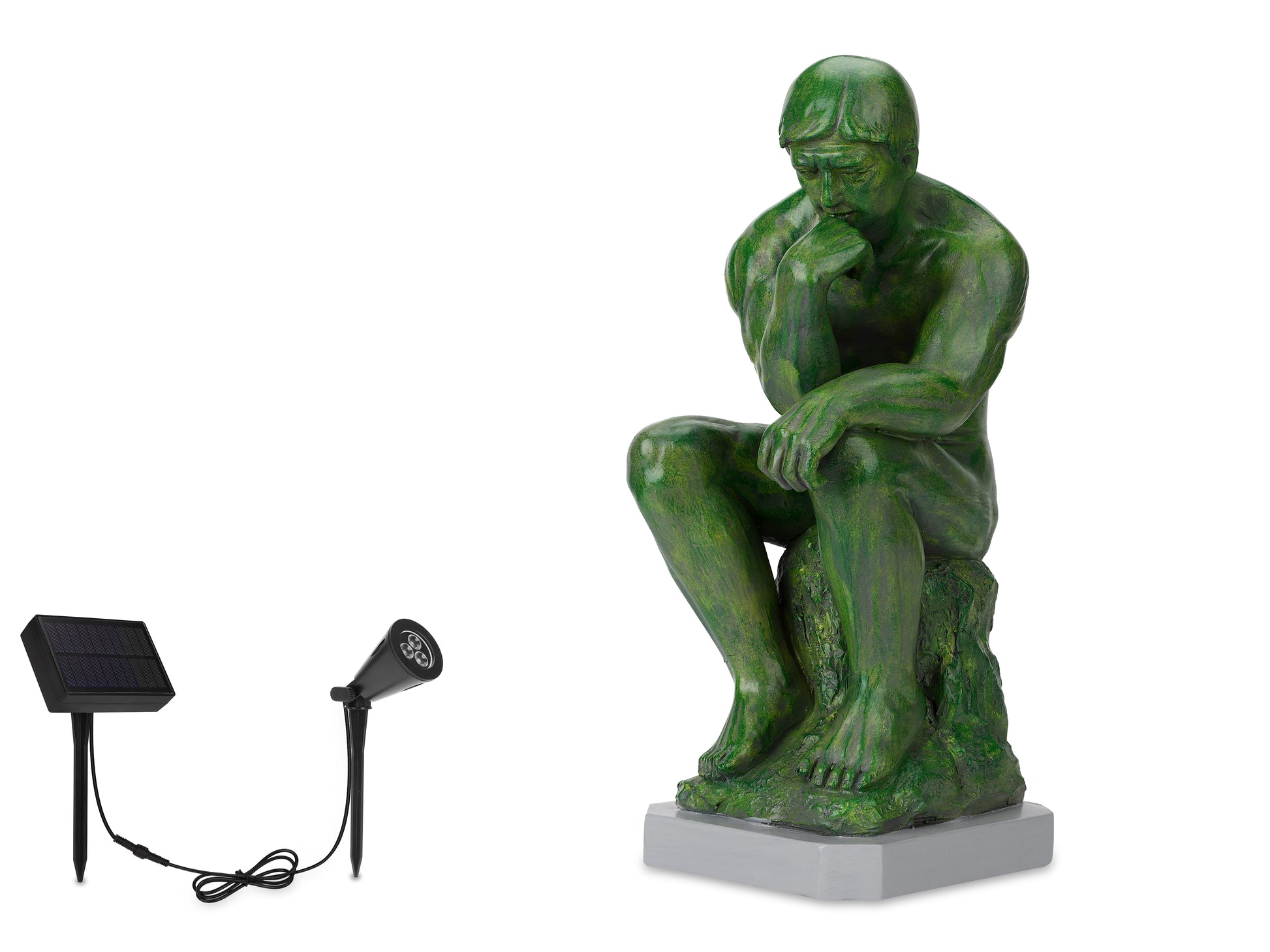 Enhance your garden, yard, or patio with the TECHKO Thinker Statue with Solar Spotlight! This Decorative Thinker Garden Statue will add a representation of the creative mind at work. Although the Thinker is seated, he is definitely not at rest. The Techko Thinker Statue with Solar Light stands 15” tall, is crafted with resin that is waterproof, long lasting and beautifully hand painted. The external solar spotlight is powered by the sun with the built-in solar panel, it will really light up the statue at night for an eye-catching decoration. The Techko Thinker Statue with Solar Spotlight will make a unique addition to your garden, yard, patio, or gift one to a friend or family member so they too can enjoy a fun and decorative space.