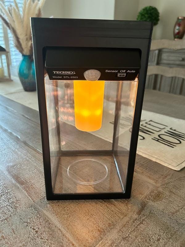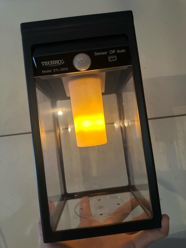 The Techko Solar Wall Sconce Lantern with flame effect really lives up to the name of the item! The picture does not do it justice for the way the flame flickers. The brightness of the light is not overpowering and it's actually perfect for the fall season. The lamp itself has a fairly durable feel and it's not heavy to install. Installation is also very easy. I really like this sconce and will look to add more around my home.